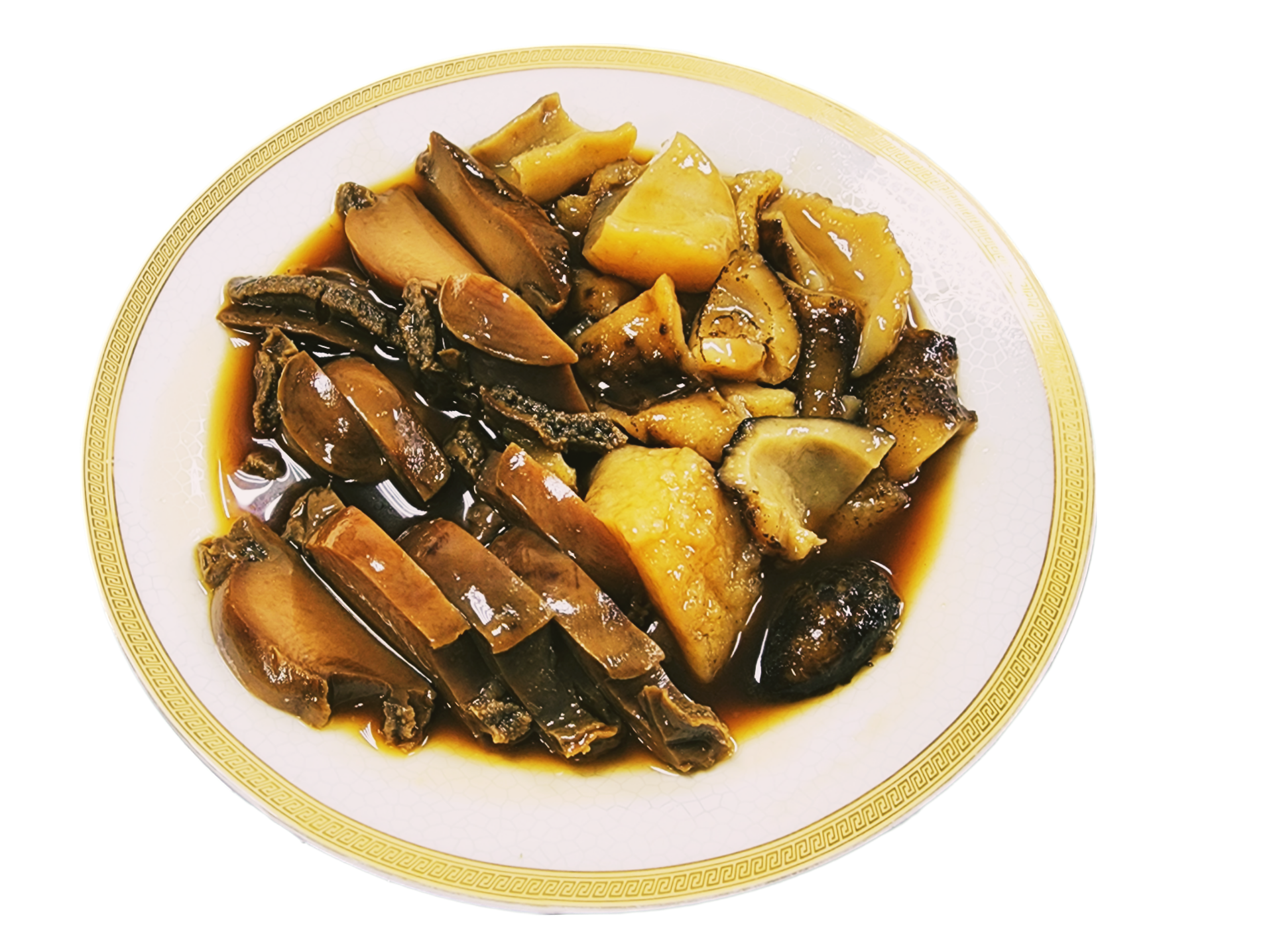 将海参、花菇倒入溏心鲍鱼的汤汁中,以小火煨煮入味